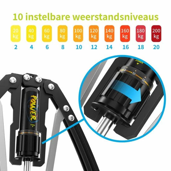 De Twister heeft 10 weerstand-niveaus, gemakkelijk instelbaar in weerstand van 10 tot 200 kg door simpelweg te draaien aan de knop.