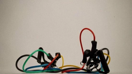 De vijf banden leveren gezamenlijk een kracht van zo’n 45 kg. Oplopend in kracht is de gele band het lichtst (4.5kg), daarna de groene band (7kg), vervolgens de rode met 9kg, daarna de blauwe (11kg), en ben je echt toe aan een krachtsinspanning, voeg dan de zwarte toe: 13kg extra.
