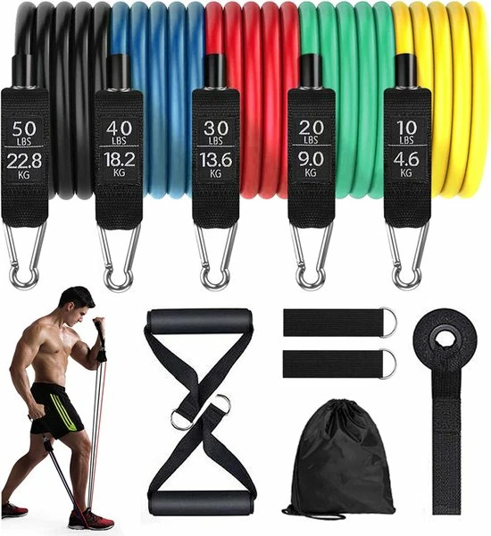 Zelfstandig thuis of buiten fitnessen? Ervaar de perfecte aanvulling op je (thuis) gymnastiekapparatuur. Ontdek de full body weerstandsbanden set van hoogwaardig elastiek. De multifunctionele fitnessbanden bieden je oneindig veel oefeningen waarmee je elke spiergroep, waar dan ook, kan trainen. Van het trainen van je benen of armen tot aan buikspieroefeningen om weer in shape te komen. De weerstdanstubes zijn uiterst geschikt voor zowel beginners als ervaren sporters.