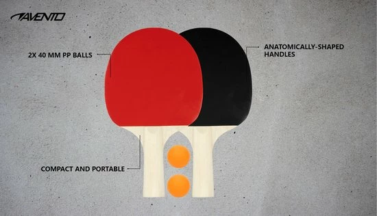 Versla je vrienden rond de tafel met de tafeltennisset van Avento. De pingpongset is perfect voor zowel thuis als op vakantie. De veelzijdige tafeltennisbatjes in deze set zijn gemaakt van vijf lagen hout. Dit zorgt ervoor dat de batjes extra stevig zijn en wel tegen een stootje kunnen. De pingpongbatjes hebben anatomische handgrepen voor een goede grip, waardoor je gemakkelijk van de forehand naar de backhand kunt wisselen tijdens het spelen. Het blad van de batjes heeft een rubberen top- en onderlaag, voor een goede balcontrole. De set komt met twee batjes en twee ballen. De pingpongballen hebben een doorsnede van 40 mm en de oranje kleur zorgt voor extra zichtbaarheid op bijvoorbeeld een blauwe tafeltennistafel.