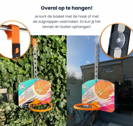 - Overal op te hangen: Ga je binnen of buiten basketballen? Of wordt het dé activiteit op je feestje? Je kunt de basket op twee manieren gemakkelijk overal ophangen: met de zuignappen of met de haak. Geen gaten in de muur en moeilijke constructies dus 😉