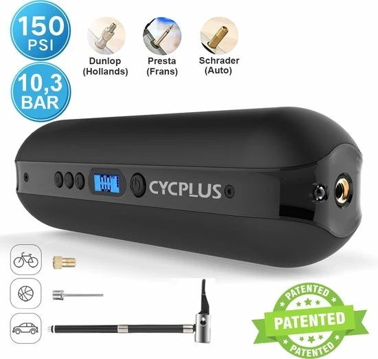 Gepatenteerde zeer sterke, intelligente en handzame compacte hoge druk (tot 10.3 Bar) portable elektrische luchtpomp| compressor met accu. Tevens Best Choice Eurobike 2022 . Deze nieuwste uitvoering van de Cycplus A3 (2023 model) met de allernieuwste technieken, is stabieler en nog nauwkeuriger dan zijn voorganger is gemaakt van het erg lichte en zeer sterke ABS en heeft bij een defect het 1e jaar 100% omruilgarantie.