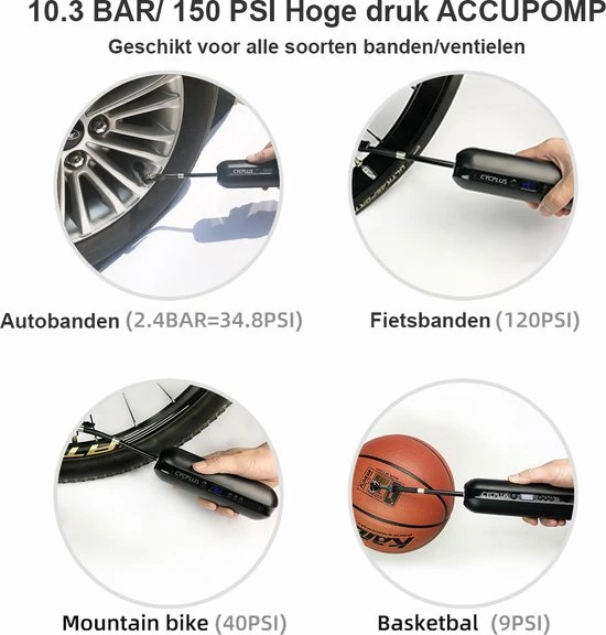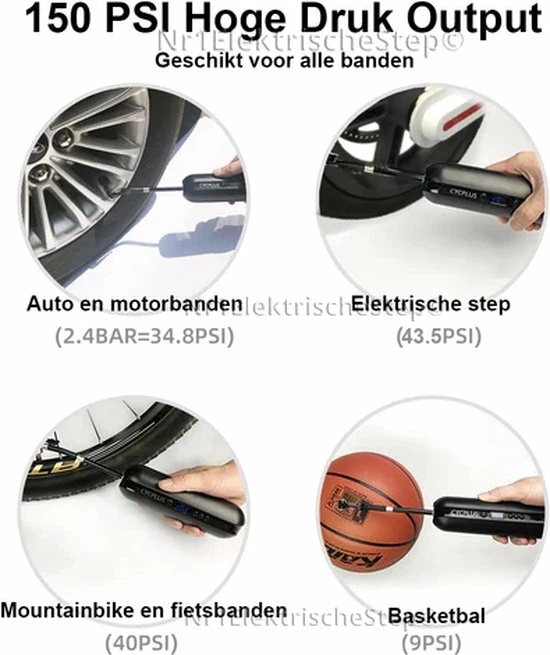 De elektrische pomp is geschikt voor een Schrader, Presta en Dunlop ventiel. Het kan worden gebruikt voor alle soorten fietsen en voertuigen, zoals bijvoorbeeld mountainbikes, racefietsen, BMX, e-bikes en elektrische steps.