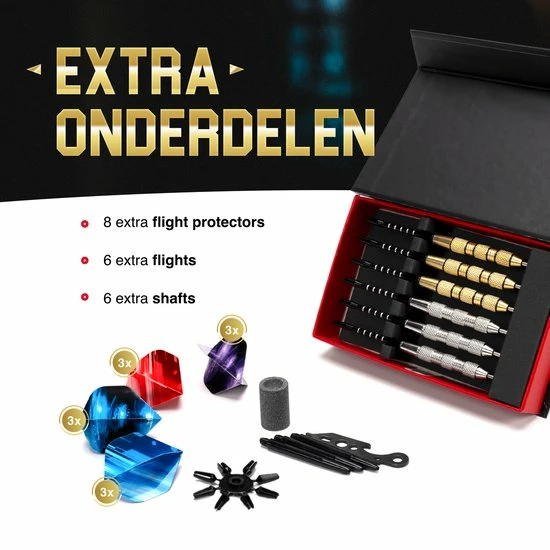 De set komt standaard met 6 extra flights, 6 extra shafts en 8 extra flight protectors. Mochten er onderdelen beschadigen of kwijtraken heb je altijd een vervangend onderdeel bij de hand. Gegarandeerd urenlang speelplezier!