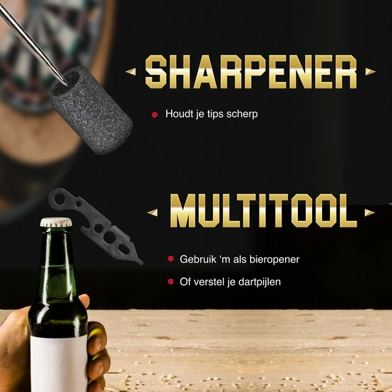 Met de multifunctionele dart tool verstel je gemakkelijk je pijlen of open je je volgende biertje. De sharpener houdt je pijlen scherp, zodat ze niet van het bord afketsen maar netjes in de roos blijven steken. Zo verzeker je je van de hoogste score.