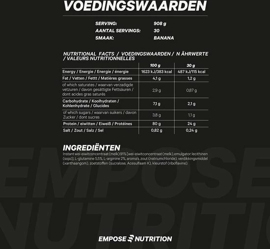 Alle smaken zijn uitvoerig getest door een breed en ervaren testpanel, hierin zijn geen concessies gedaan en alleen de allerbeste smaak gecombineerd met de meest hoogwaardige ingrediënten hebben het eindproduct gehaald. Daardoor heeft de Empose Whey Protein alleen hoogwaardige ingrediënten waardoor je per scoop niet alleen 24 gram whey eiwit binnenkrijgt maar ook de nodige L-glutamine en L-arginine. Deze ondersteunen in het herstel van de spieren. En natuurlijk niet onbelangrijk, geen toegevoegde suikers, laag in calorieën en vet-arm.