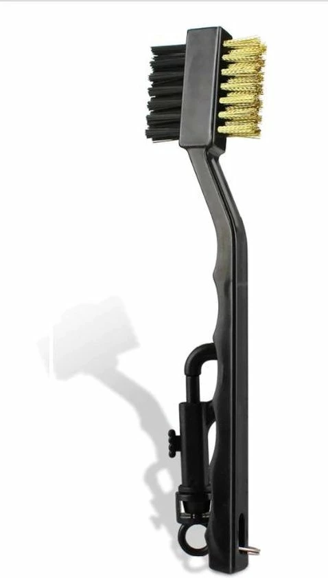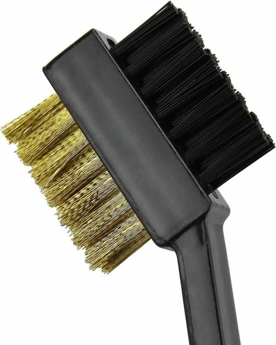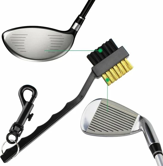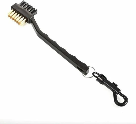 Deze tweezijdige golfclub cleaner is ideaal voor het schoonmaken van je clubblad. Een schoon clubblad heeft een positieve impact op de richting en vlucht van je bal. Met deze borstel verwijder je snel en makkelijk gras en modder van de groeven van je club. De ene zijde bevat kunststof borstelharen en de andere zijde is een staalborstel.