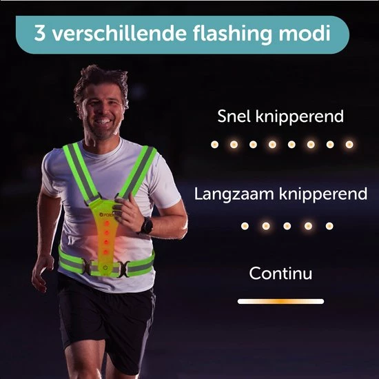 Samen uit met het ForDig veiligheidsvest, samen thuis! De 250 lumen per LED lampje in de voor- en achterkant van het hesje en de reflectieve neon groene kleur zorgen ervoor dat je zichtbaar bent tot zelfs 300 meter ver! De 3 verschillende flashing modi; snel, langzaam en continu maken het veiligheidshesje ideaal voor wandelen, hardlopen, fietsen, schaatsen en ook als veiligheidsmiddel voor de buurtpreventie. Door middel van de gemakkelijk te verstellen riemen en het aerodynamische design is het hardloopvest van ForDig geschikt voor volwassenen en kinderen vanaf 15 jaar. De 120mAh batterij is gemakkelijk en milieuvriendelijk op te laden met de bijgeleverde USB kabel en gaat vervolgens tot wel 12 uur mee. ForDig bestaat alleen met en voor jou, bestel vandaag nog!