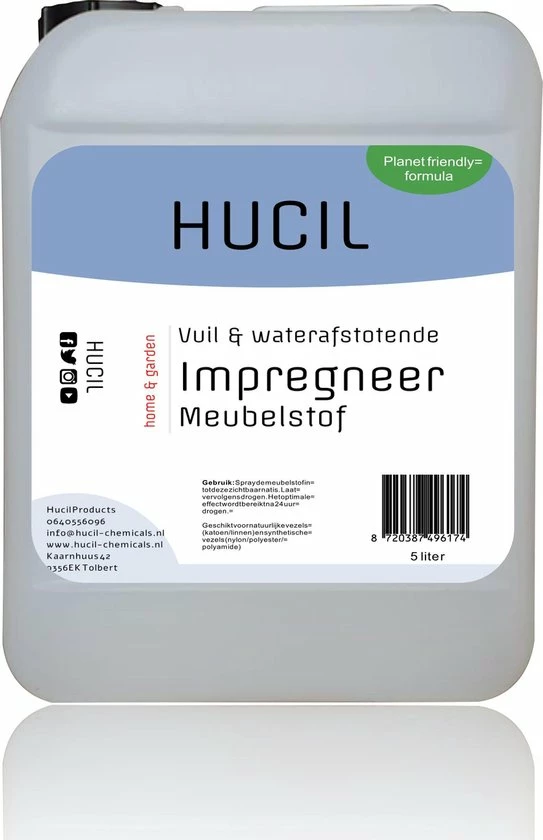 Dit fantastische impregneermiddel van Hucil maakt al uw stoffen vuil en waterafstotend. Te gebruiken als impregneerspray in een plantenspuit of breng het aan met een verfroller.