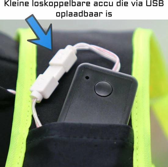 - De lampjes zijn waterdicht. De accuutjes zitten in aan de binnenkant van het vest en zijn op zich vrij van regen. De accuutjes zelf zijn niet waterdicht
