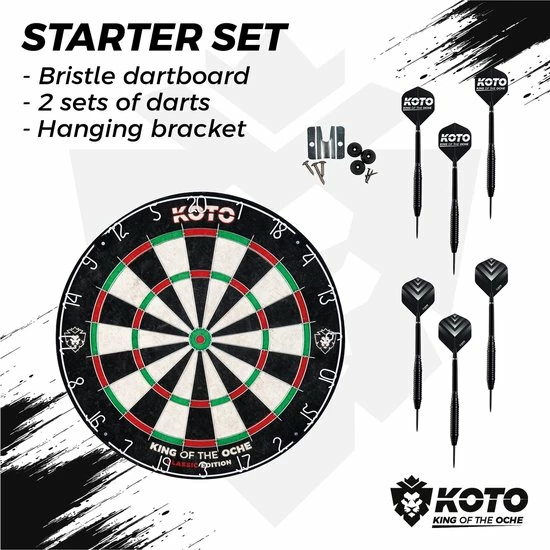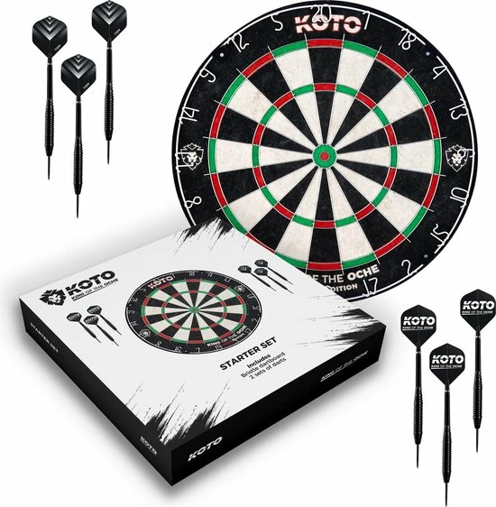 ✅ Complete set: Deze complete starter set wordt geleverd met een bristle dartbord met officiële afmetingen en een draaibare cijferring, een ophangbeugel voor het dartbord en twee complete sets dartpijlen van 23 gram. De dartpijlen zijn voorzien van stevige nylon shafts en stoere KOTO flights.