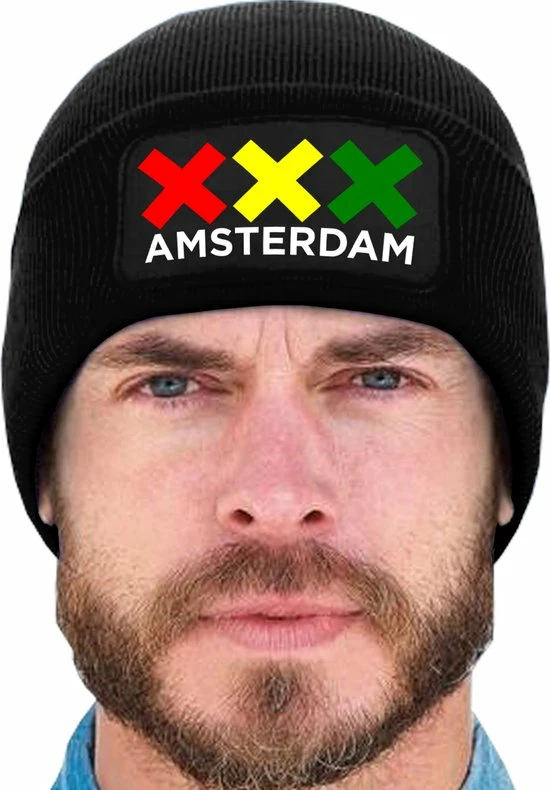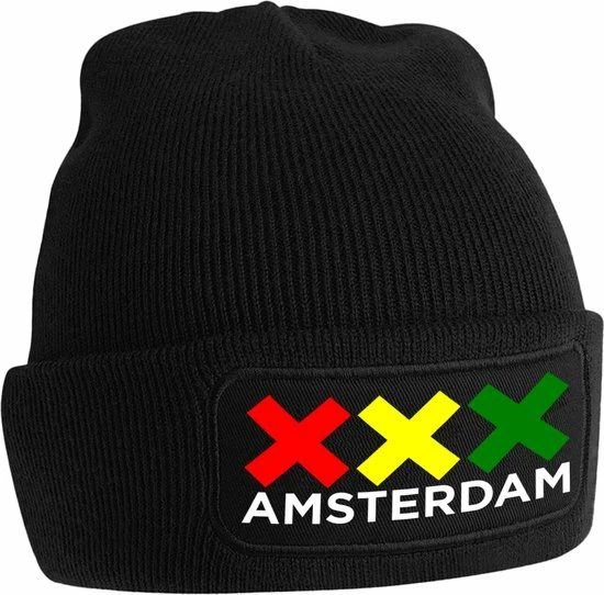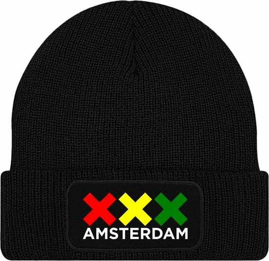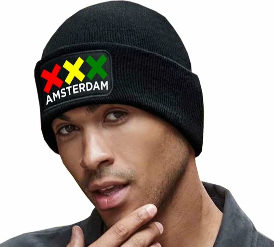 - Zwarte muts met witte tekst (Amsterdam) en de drie Andreas Kruisen in de kleuren rood, geel en groen.