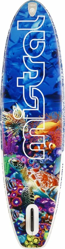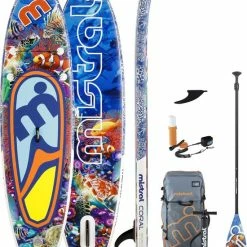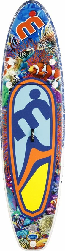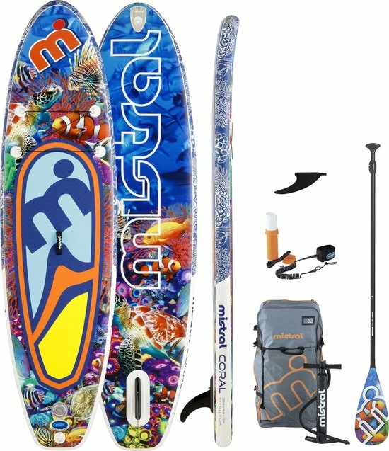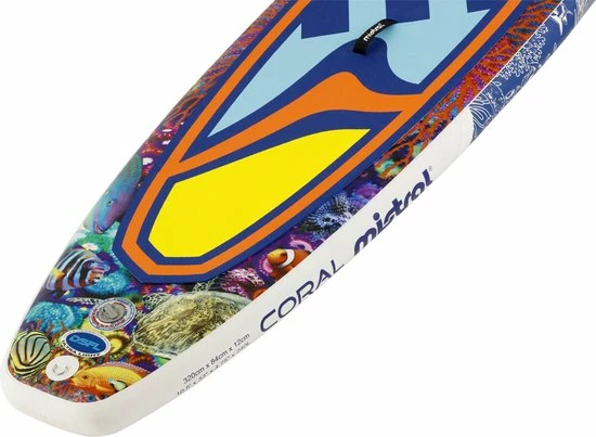 De Mistral Coral 10’5 is een opblaasbare SUP met een kleurrijk design dat is geïnspireerd op basis van tropische riffen, vandaar de naam ‘Coral’.