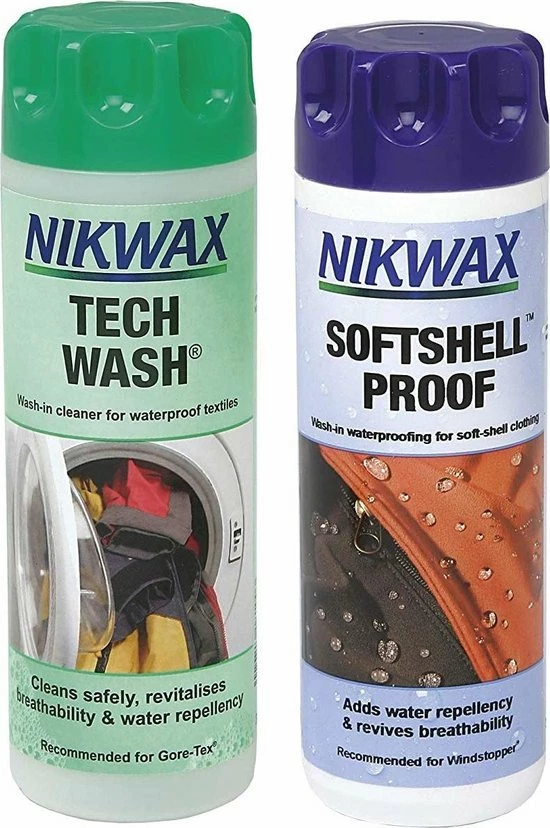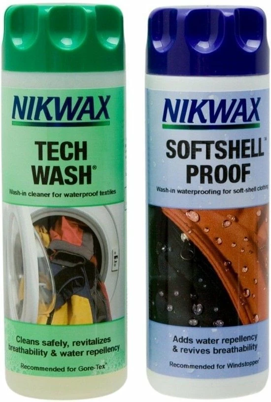 Nikwax Softshell / Tech Wash twinpack 300ml bestaat uit de Tech Wash en Softshell Proof wasmiddelen. De Tech Wash zorgt ervoor dat vuil uit de stof wordt gehaald zonder de stof aan te passen. Het revitaliseert de ademende en waterafstotende eigenschappen van het kledingstuk. De NikWax Shoftshell Proof zorgt voor en langdurige waterafstotende werking en herstelt de ademende werking van de softshell jas. Daarnaast zorgt het voor herstel van impregnatie die verloren ging door wrijving of slijtage. Voor het beste resultaat eerst met NikWax Tech wash wassen.