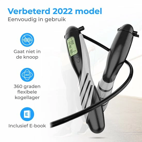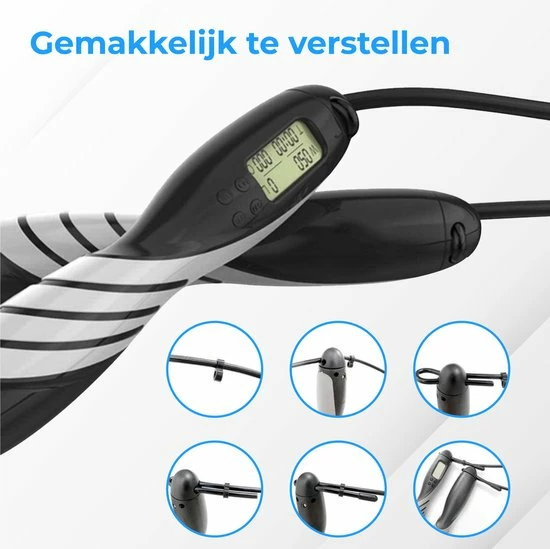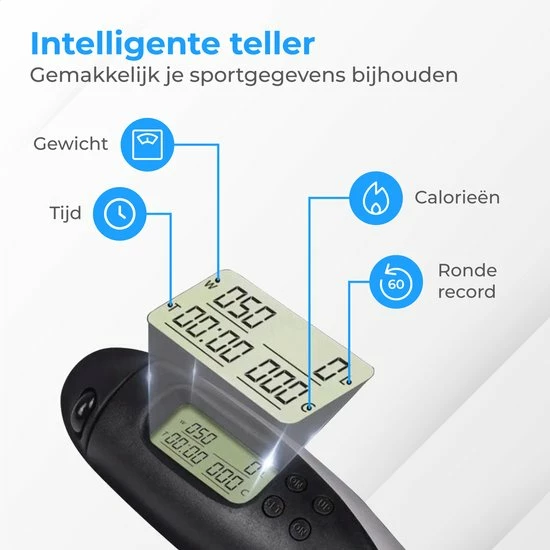 Dankzij de digitale teller hoef je niet langer zelf te tellen. Het springtouw registreert elke beweging! In de praktische handvaten zit een digitaal schermpje verwerkt dat op overzichtelijke wijze de resultaten van jouw work-out weergeeft. Via het led-scherm kun je zien hoeveel rondjes je gesprongen hebt, hoeveel calorieën je hebt verbrand tijdens de sessie en hoe lang je aan het springen bent.
