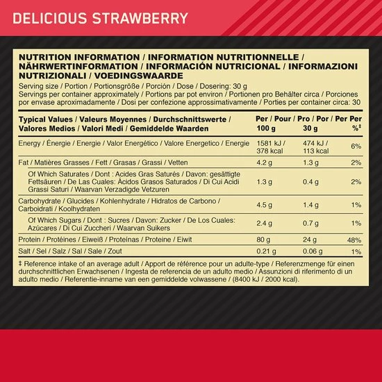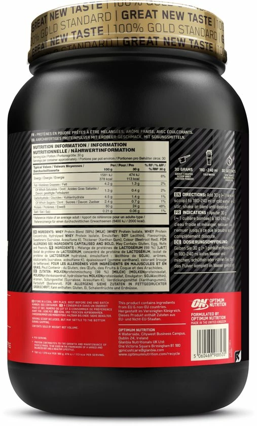 De proteïneblend van Optimum Nutrition bestaat voornamelijk uit whey isolaat, waardoor iedere shake maar liefst 24 gram hoogwaardige eiwitten, 3.5 gram glutamine, 5 gram BCAA’s en slechts 3 gram koolhydraten bevat. Dit maakt Gold Standard Whey de perfecte shake voor spierherstel na een training.