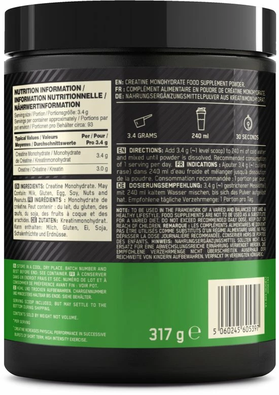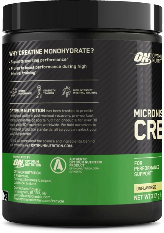 Optimum Nutrition Creatine helpt prestaties te verbeteren, zorgt voor meer kracht en stimuleert spiergroei bij explosieve krachtinspanningen. Optimum Creatine bevat alleen gemicroniseerde kwaliteit waardoor het poeder gemakkelijk op te nemen en te mengen is. De creatine is volledig smaakloos en lost erg goed op in bijvoorbeeld water of een vruchtensap.