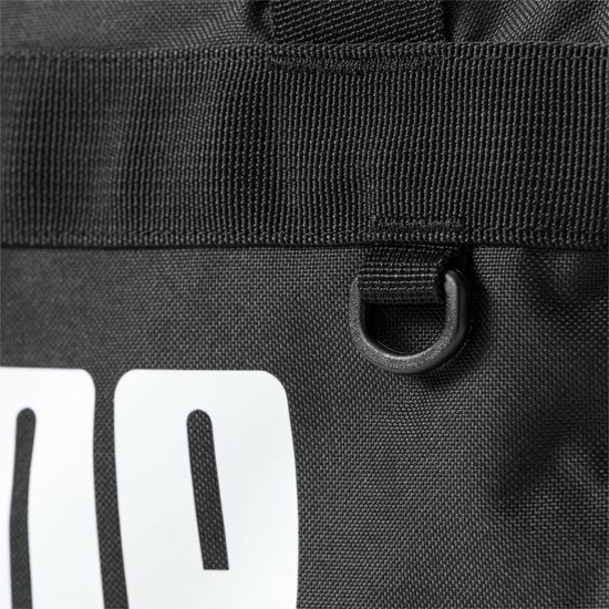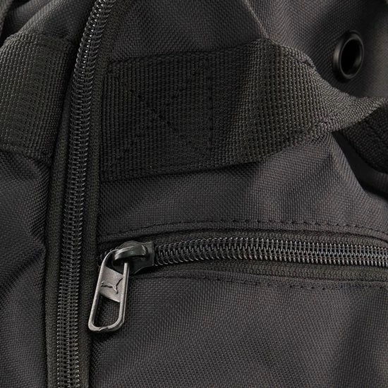 Two-way zip opening into main compartment, one side zip compartment with shoe inlay and metal eyelit, one flat side zip pocket, one side mesh pocket, webbing carry handles connectable through press button closure, adjustable shoulder strap with branded shoulder pad, D- ring on main body for possible attachments, padded bottom panel with PU material, PUMA branded 150D Polyester lining with PU backing, branded metal zip puller’s on main compartment, branded metal zip puller on side compartments, big PUMA wordmarked logo print on front panel.
