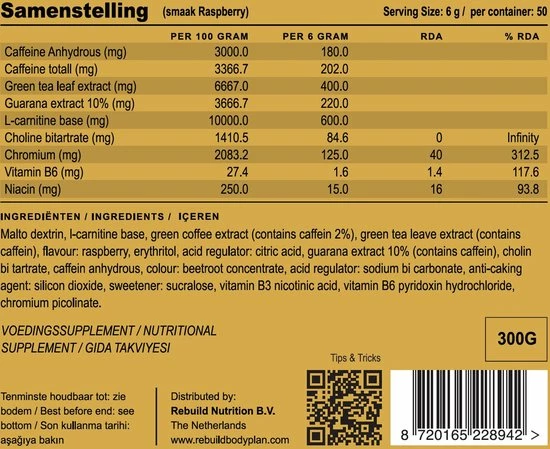 Voor de sporter die graag wil dalen in vetpercentage is deze kwalitatieve fat burner van Rebuild Nutrition een ware uitkomst. Dankzij de perfecte mix van hoogwaardige natuurlijke (planten extracten) ingrediënten is het de sterkste formule op de markt. Mocht je net dat beetje extra hulp nodig hebben bij het droogtrainen of geleidelijk aan vet wilt verliezen, dan is dit supplement onmisbaar.