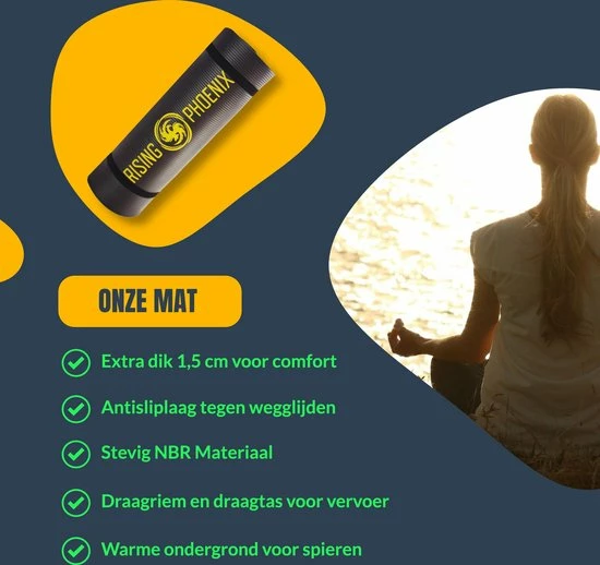 Bij grond oefeningen wil je natuurlijk geen pijn aan je knieën, handen of rug. Uitglijden en vallen is al helemaal niet de bedoeling. Onze Rising-Phoenix Yoga mat is extra dik en heeft een antisliplaag die zorgt dat je pijnloos en in balans je yoga sessie of fitness workout kunt uitvoeren. Dankzij de tas en draagriem neem je hem overal gemakkelijk mee naar toe. Met het handige E-book kun je ook zonder ervaring meteen van start.