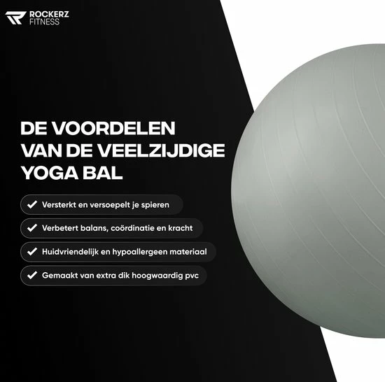 Deze veelzijdige bal van Rockerz Fitness is er niet alleen voor yoga, want het is ook een fitness bal, gym bal en een pilates bal. De bal wordt namelijk ook veel gebruikt voor fitness- en pilates oefeningen, zowel thuis als in de sportschool. Doordat de bal op veel manieren inzetbaar is, kan je er je buik, benen, billen, armen en rug uitstekend mee trainen. De hoeveelheid aan oefeningen is ontelbaar. De fitnessbal is makkelijk in gebruik en licht van gewicht. Ook wordt hij vaak gebruikt bij revalidatie-oefeningen om na een blessure de stabiliteit en kracht in de spieren terug te trainen.
