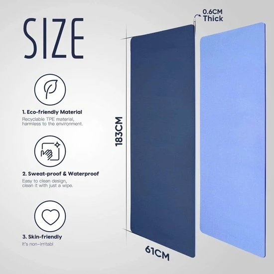 Optimaal formaat en gemakkelijk schoon te maken: de yogamat meet 183 × 61 × 0,6 cm en is geschikt voor de meeste mensen en gelegenheden. Het is 0,6 mm dik en biedt een hoge veerkracht en bescherming voor knieën en gewrichten. Het is ook heel gemakkelijk schoon te maken. Veeg na elk gebruik zweet weg met een vochtige poetsdoek. Hij ziet er verfrist en nieuw uit.