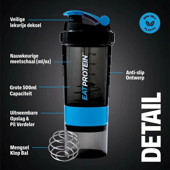 Grote 500ml capaciteit shaker met draadbal voor uitstekende consistentie van jouw shakes, Gemaakt van BPA vrij plastic van hoge kwaliteit en is vaatwasser bestendig.