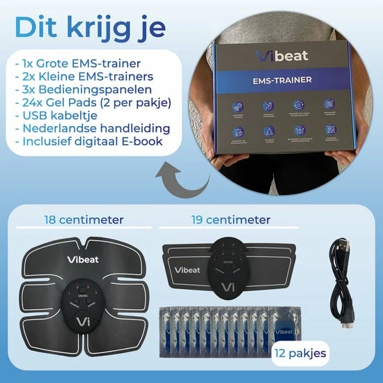- Inhoud: 1x Grote EMS-trainer – 2x Kleine EMS-trainer – 1x USB kabel – 24x Gel Pads – 1x Handleiding