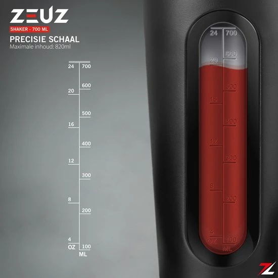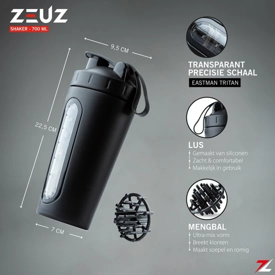 Met de nieuwe shakebeker van ZEUZ® kan je komende jaren zeker vooruit! Door het sterke ontwerp en de unieke mixer bal mengt deze krachtige blenderbeker supplementen & ingrediënten soepel en effectief tot een prachtig mengsel. Daarnaast is er in de shakebeker een doorzichtige meettabel opgenomen tot 700ml waardoor je altijd weet hoeveel er nog in de beker zit. De shakebeker is BPA-vrij en eenvoudig te reinigen. Verder zal in tegenstelling tot plastic shakebekers het logo niet verdwijnen of vervagen doordat ZEUZ® een speciale lastertechniek gebruikt waardoor het logo levenslang op de shakebeker staat.